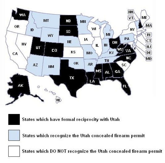 A. The Utah Concealed Firearm Permit is valid in 30+ states. The below map shows reciprocity and recognition coverage as of March 29, 2010. Because laws frequently change, it is important to keep informed and understand the applicable firearm laws of the states with which you would plan to visit. To see a list of states that have formal written agreements to honor a Utah Concealed Firearm Permit, click here.